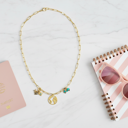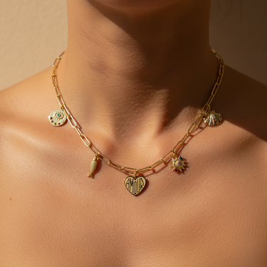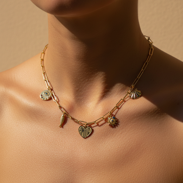 Celebrate love, luck, and sun-kissed days by the sea. The AMOUR Heart Charm Necklace layers a modern paperclip chain with five meaningful talismans—each chosen for its story and finished in gold.