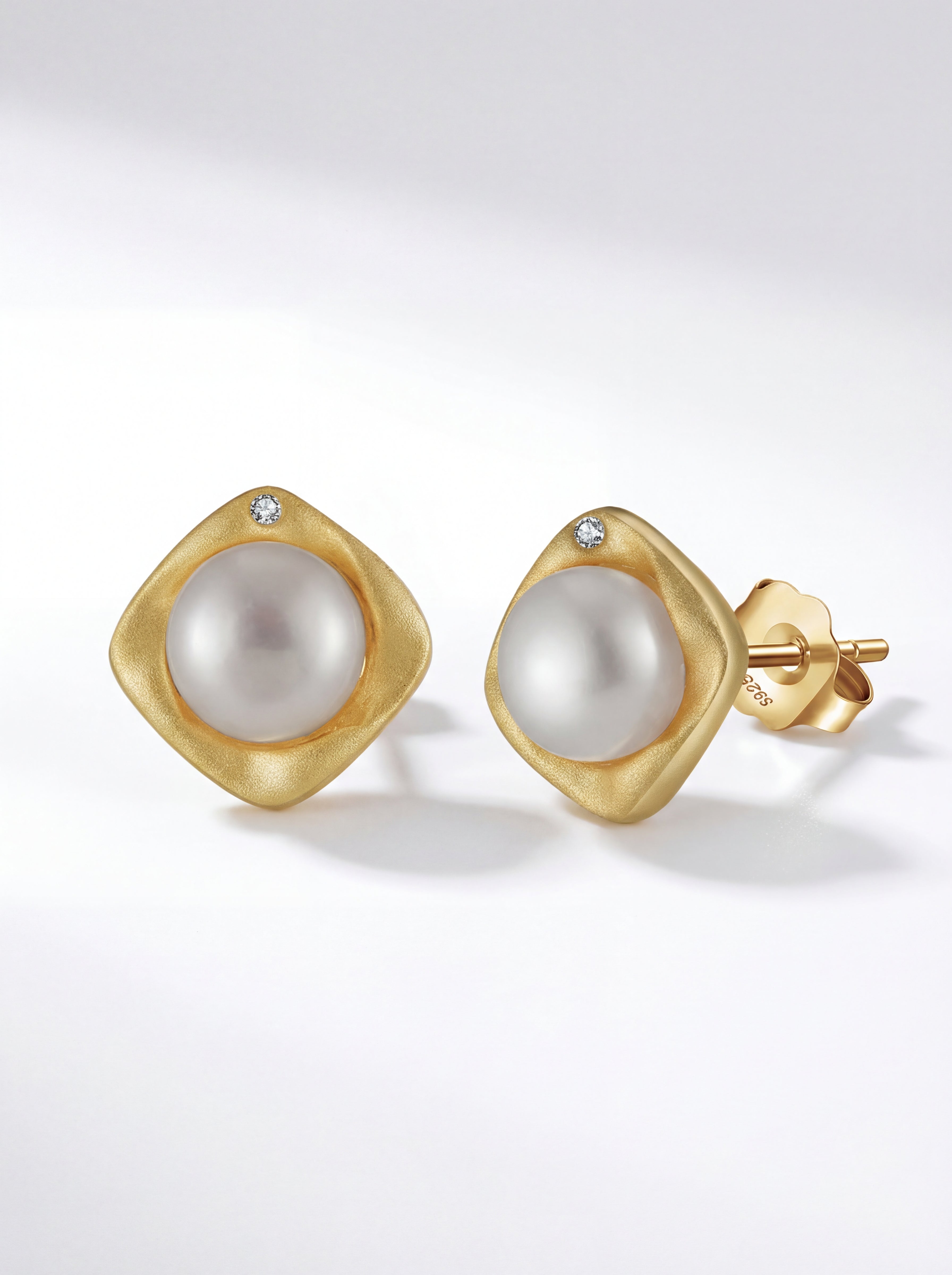Close-up of cushion bezel gold pearl earrings on textured white fabric. Close-up of cushion bezel gold pearl earrings on textured white fabric.