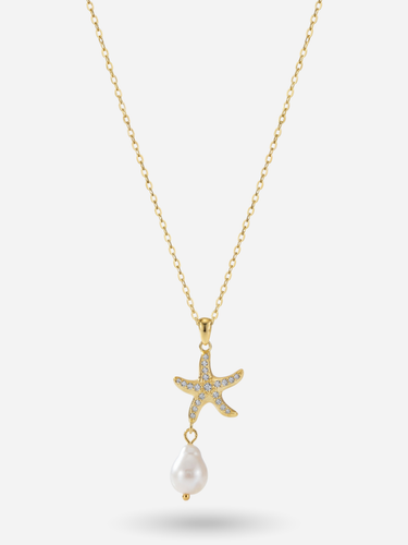 Crafted in 925 Sterling Silver and finished in radiant 14K gold plating, the starfish pendant gently suspends a luminous pearl drop, adding an ethereal glow to your neckline. With its 18-inch chain, this piece is perfect as a standalone statement or a delicate layering accent.