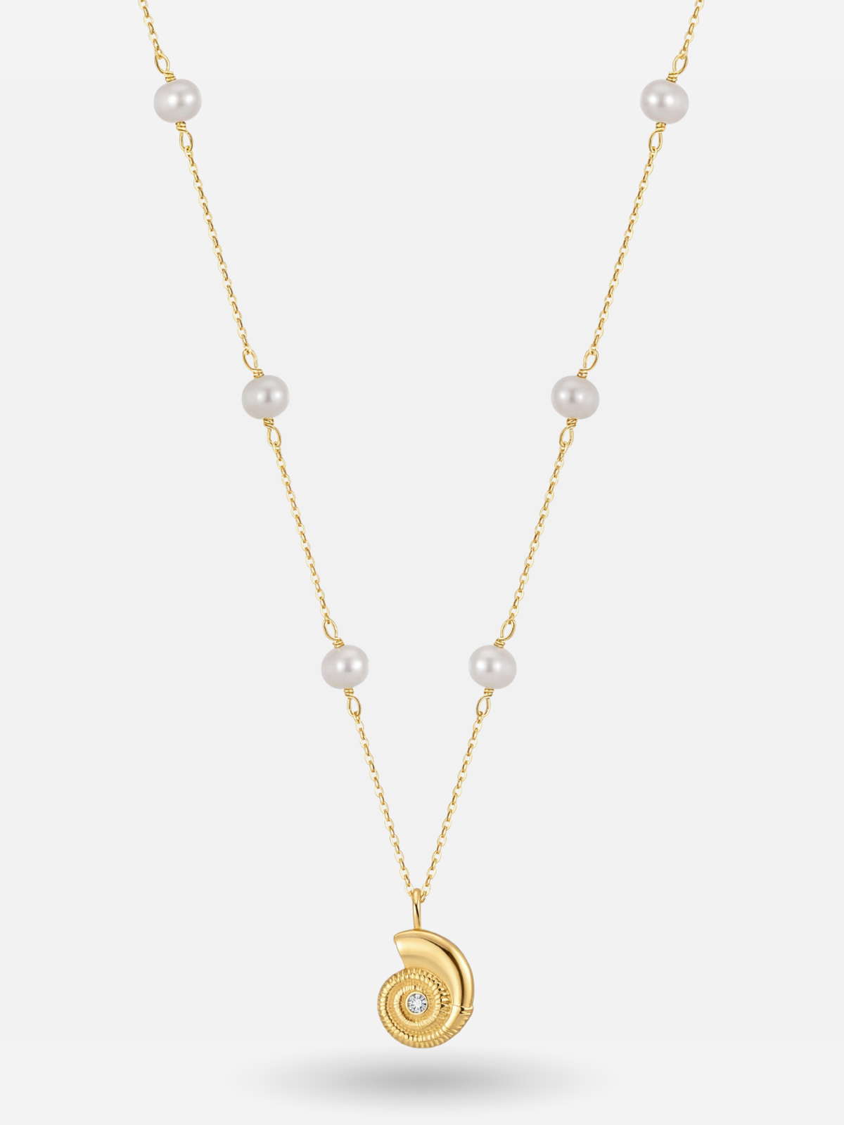 Inspired by the eternal spirals of the sea, the Nautilus Pearl Pendant Necklace embodies coastal elegance in its purest form. A gold plated sterling silver nautilus shell, detailed with a delicate CZ at its center, dangles gracefully between luminous cultured freshwater pearls. This elegant 16-inch chain, extendable by 2 inches, offers a minimalist yet luxurious statement piece for those who carry the ocean close to their heart.
